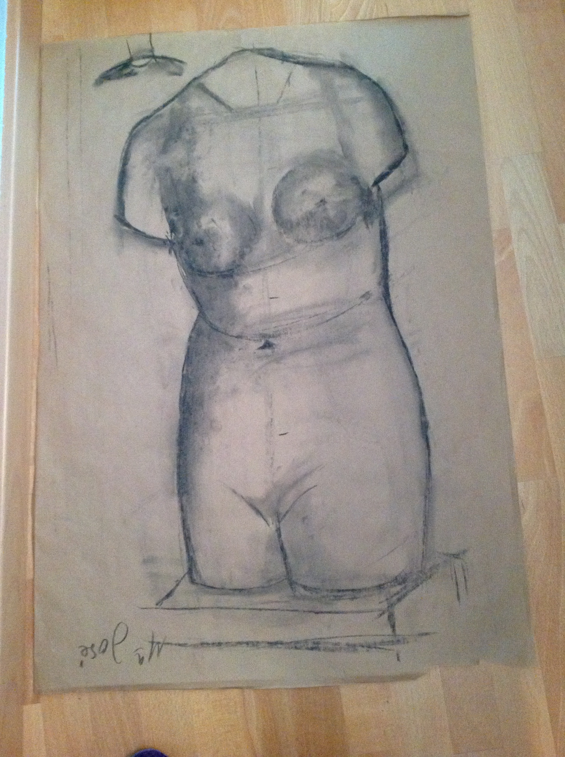 El papel es de estraza pero permite que el carboncillo se fije bien. Lo cierto es que la miro y la veo enorme, pero fue la primera. Es un curso de dibujo al natural en el que aprendo y me lo paso bien.