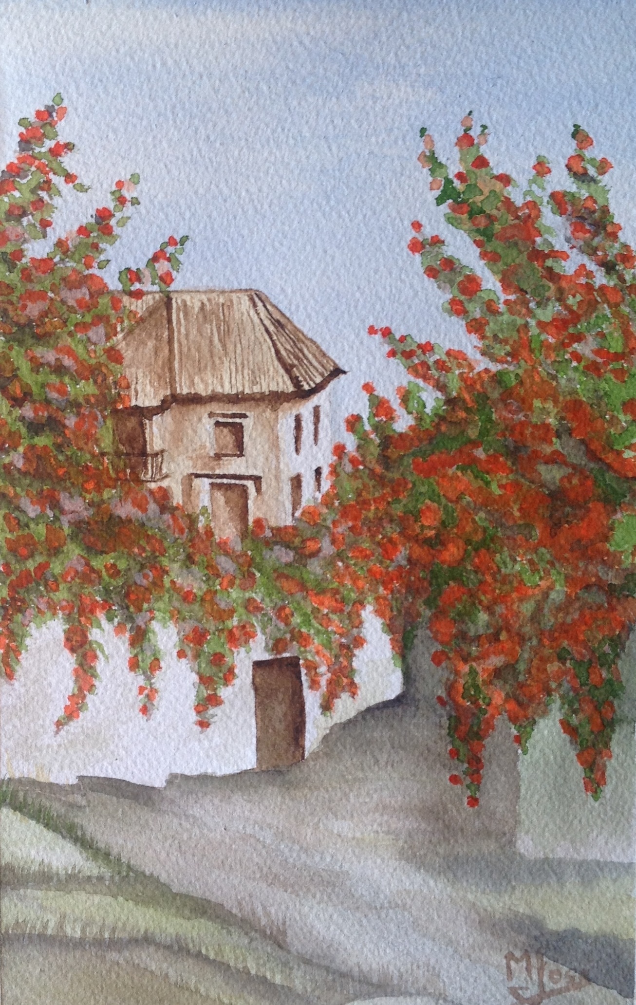 La acuarela presenta una casa que podemos encontrar en cualquier punto del Sur, donde las plantas tienen casi más importancia que la misma vivienda porque aportan frescor y sombra en los meses de mayor calor.