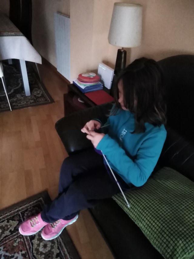 Cuando acaba los deberes del colegio es ella misma la que toma las agujas y se pone a tejer, quiere terminar una bufanda para su muñeca…, Yo le digo que es «mi araña doméstica».